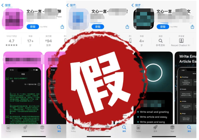 但是在搜索栏中搜“文心一言”,还是会推荐一堆非官方的App,包括搜Chatgpt也是一个道理。